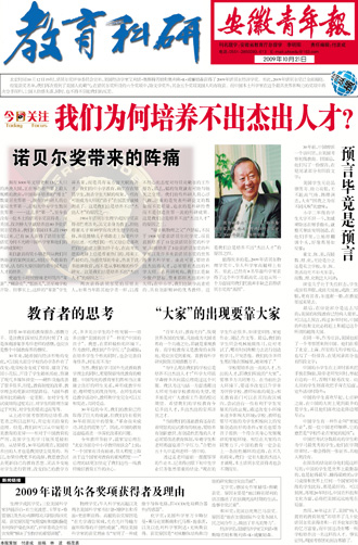 新闻纵横 预言毕竟是预言 我们为何培养不出杰出人才? 教育者的思考 “大家”的出现要靠大家 2009年诺贝尔各奖项获得者及理由