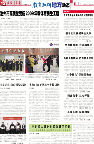 池州市高质量完成2009年教体育民生工程 老师们的舞台 《安徽青年报》霍山学生记者站授牌 《安徽青年报》阜南县学生记者站授牌仪式 多部门联手共筑平安校园网 从职教大县到职教强县的跨越——太湖县召开中职学校管理工作经验交流会 从职教大县到职教强县的跨越——太湖县召开中职学校管理工作经验交流会 新闻速递