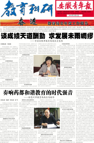 奋进 教育局长年度工作报告 谈成绩天道酬勤 求发展未雨绸缪——专访合肥市教育局局长方东玲 奏响药都和谐教育的时代强音——访亳州市教育局局长马昭华