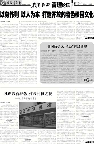 共同的信念“撬动”班级管理 以身作则 以人为本 打造开放的特色校园文化 独创教育理念 建设礼仪之校——记淮南市英才中学