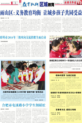 雨山区:义务教育均衡 让城乡孩子共同受益 蚌埠市2014年三级双向交流挂职全面启动 合肥市蚌埠路第三小学开展“爱粮节粮”宣传活动 合肥市屯溪路小学学生割稻忙 谯城区青云分校举行一年级新生入队仪式 新闻速递
