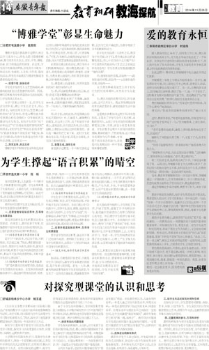 教学研究 “博雅学堂”彰显生命魅力 教育探索 为学生撑起“语言积累”的晴空 学科一见 对探究型课堂的认识和思考 教育纵横 爱的教育永恒