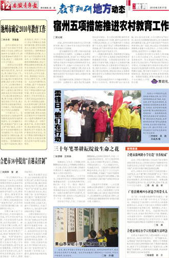 池州市确定2010年教育工作 宿州五项措施推进农村教育工作 雷锋日,他们在行动 合肥市38中提出“首遇责任制” 三十年笔墨耕耘绽放生命之花 黄山市实验小学拓展第二课堂 新闻速递