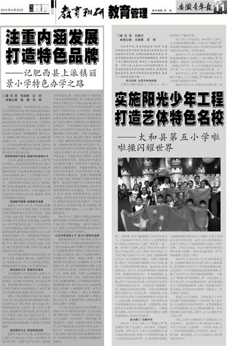 注重内涵发展 打造特色品牌 ——记肥西县上派镇丽景小学特色办学之路 实施阳光少年工程打造艺体特色名校 ——太和县第五小学啦啦操闪耀世界