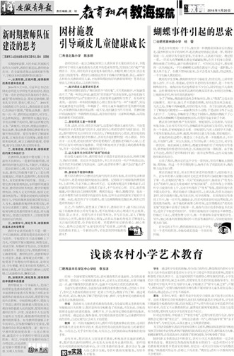 教育探索|因材施教引导顽皮儿童健康成长 教学反思|蝴蝶事件引起的思索 教学实践|浅谈农村小学艺术教育 特别推荐|新时期教师队伍建设的思考