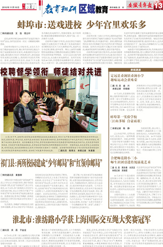 蚌埠市:送戏进校 少年宫里欢乐多 校聘督学领衔 师徒结对共进 祁门县:两所校园建成“少年邮局”和“红领巾邮局” 新闻速递 淮北市:淮纺路小学获上海国际交互绳大奖赛冠军
