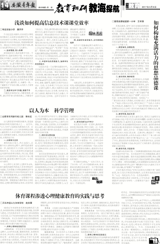 浅谈如何提高信息技术课课堂效率 幼儿教研 以人为本 科学管理 教育实践 体育课程渗透心理健康教育的实践与思考 教育探索 如何构建充满活力的思想品德课
