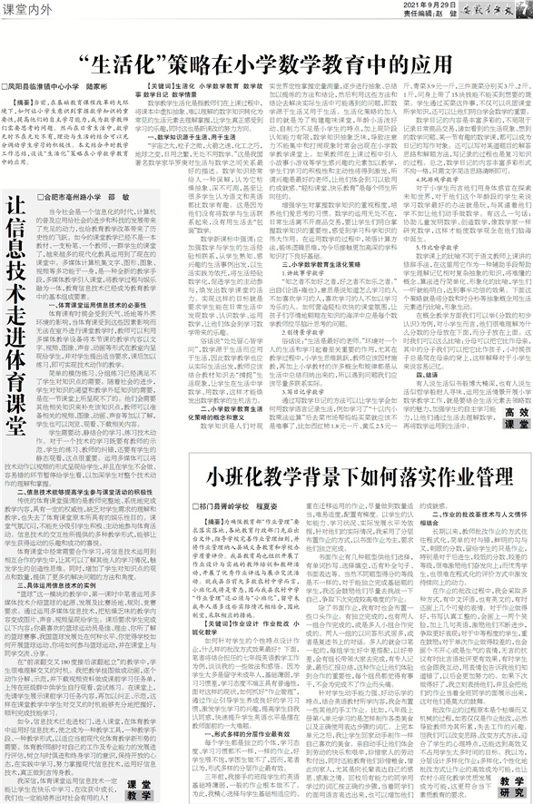 “生活化”策略在小学数学教育中的应用 让信息技术走进体育课堂 小班化教学背景下如何落实作业管理