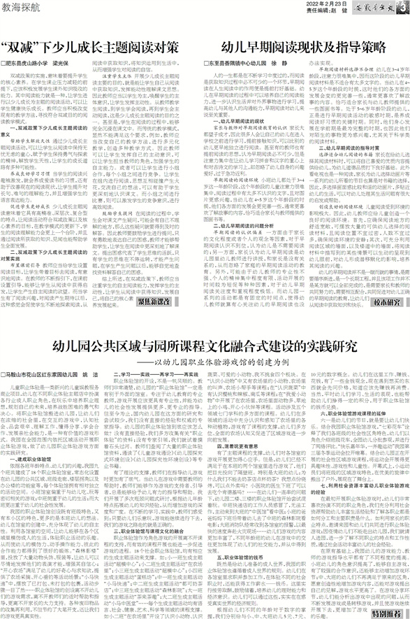 “双减”下少儿成长主题阅读对策 幼儿早期阅读现状及指导策略 幼儿园公共区域与园所课程文化融合式建设的实践研究 ——以幼儿园职业体验游戏馆的创建为例