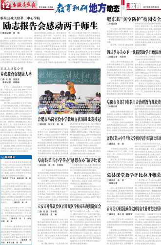 合肥市第55中学开展文学社团写作实践评比活动 励志报告会感动两千师生 歙县课堂教学评比拉开帷幕 养成教育促健康人格 霍山县五项措施确保贫困寄宿生补助发放到位 新闻速递 合肥市马岗实验小学教师喜获演讲比赛桂冠 阜南县第五小学举办“感恩在心”演讲比赛 六安市叶集试验区召开城区学校布局规划论证会 肥东县“真空防护”校园安全 泗县举办关心下一代捐资助学捐赠活动 阜阳市多部门重拳出击治理教育乱收费
