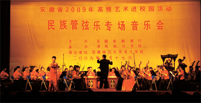 10月17日晚7点,由省教育厅主办的“2009年安徽省高雅艺术进校园活动”走进了淮南师范学院,来自安徽师范大学民族管弦乐团和大学生庆萍合唱团的120多位师生在淮南师范学院老校区大学生活动中心为全院师生带来了一场精彩的音乐会。