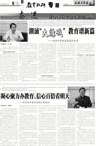 展望滁州市2010年的教育工作,张勇局长信心满怀地告诉记者,该局今年将进一步解放思想,更新观念,深化改革,科学发展,巩固提高义务教育均衡发展,大力推进职业教育,加强教师队伍建设,促进各级各类教育协调发展,全面提高教育教学质量和办学品位,办人民满意教育,服务经济社会发展。具体而言,滁州市教育局今年将主要围绕“八个提高”开展工作,即提高学前教育发展水平;提高义务教育保障水平;提高高中阶段教育普及程度;提高职业教育服务能力;提高各级各类学校的教育质量;提高教师队伍整体素质;提高滁城教育品位;提高社会对教育的满意程度。