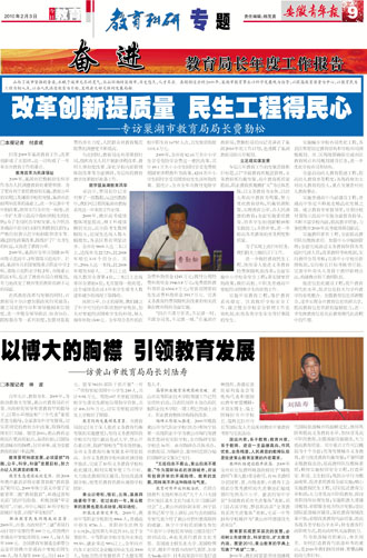 百年大计,教育为本。2009年,为推动教育大发展,黄山市教育局在市委、市政府的领导和省教育厅的指导下,以邓小平理论和“三个代表”重要思想为指导,全面落实科学发展观,切实贯彻党的教育方针政策,取得的成绩有目共睹。展望2010,黄山教育必将站在更高的起点,奋进向前,以国际旅游城市的胸襟,包容并举,成为安徽教育的窗口和品牌。 |