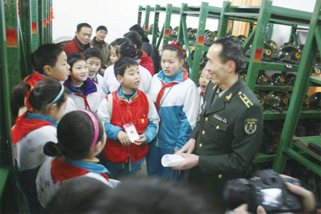 为了让孩子们的寒假生活更加丰富有趣,阜阳市颍州区鼓楼小学开展“红领巾拥军优属大行动”系列活动。2月2日上午,活动小组近三十名师生在李松校长的带领下,来到颍州区人民武装部,参观了“装备器材库”、“荣誉室”、“阅览室”等场所,接受了一堂生动的国防教育课。