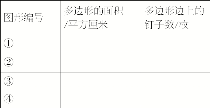 师:如果多边形里面的钉子数为2时,有什么规律呢?请同学们在钉子板上围一围,并填写表格。(学生操作后汇报)