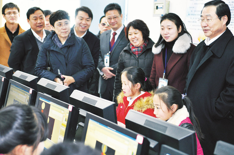 图为2015年12月16日,国家督学、宁夏自治区人民政府教育督导室专职副主任衡鸣(女,右三),中共安徽省委教育工委委员、安徽省教育厅副厅长金燕(女,左四),合肥市政府副秘书长高晓光(男,右一)等,对肥西县创建国家义务教育发展基本均衡县进行评估认定。