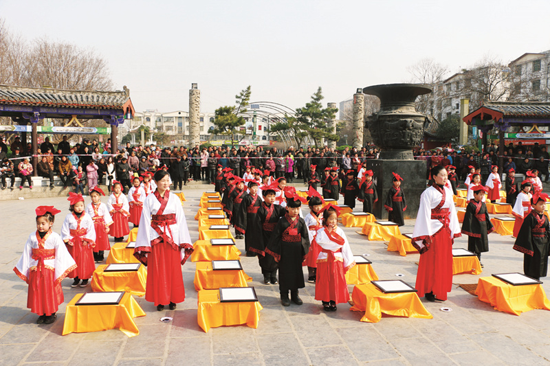 前不久,由阜南县委、县政府主办,阜南县第一小学协办的一场古装学童“开笔礼”仪式在县城街心公园举行。“开笔礼”是启蒙教育的第一课,是中国传统中对少儿开始识字习礼的一种启蒙教育形式。这次“开笔礼”分别进行了正衣冠、朱砂开智、击鼓鸣智、诵读经典、参拜孔子像、礼谢亲师、启蒙训导、奉茶礼、赠书送礼等步骤。通过这些庄重的仪式,同学们和家长都明白了入学是人生中的一件大事,是开始学知识、学习做人、走向成才的起点,以此激发孩子们求学求知的欲望,珍惜读书的机会,培养孩子们对知识及传统文化的感情。 |