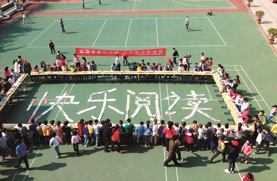 而针对学生,学校制定一套多层次、有重点且有年级特色的系列读书活动。比如,学校每天都开展的“晨读午阅”中,一年级背诵《弟子规》、二年级背诵40首古诗、三年级会讲学校文化墙上的18个成语故事、四年级排练课本剧、五年级召开读书主题队会、六年级组织参加区级及以上各类比赛。