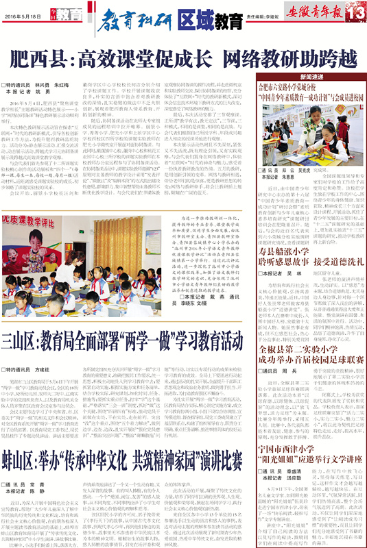 为进一步推动教研训一体化,提升教师的专业素养、课堂教学效率和质量,促进学生全面发展,由池州市教研室主办、青阳县教研室协办、青阳县蓉城镇中心小学承办的“池州市2016年小学语文青年教师优质课教学评比”活动在青阳县蓉城镇第一小学举行。通过此次评比活动,进一步深化了池州市小学语文的课程改革,加强了语文教师们教学研究的意识,充分体现了池州市小学语文青年教师们良好的教学涵养和锐意进取的教学追求。 |