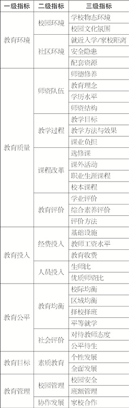通过集体座谈、个别访谈等形式,访谈对象主要是来自小学、初中、高中的学生和学生家长、教师及教育管理者,共计访谈385人次,分别来自合肥、阜阳、铜陵、安庆、淮北、马鞍山、滁州、宿州、六安等9个城市。对公众眼中的基础教育及关注的主要内容进行收集、梳理、归纳,构成以被访对象为代表的公众关注的基础教育指标体系,主要体现在六个纬度:教育环境、教育质量、教育投入、教育公平、教育目标以及教育管理,每个纬度包括若干分项指标(见表1)。