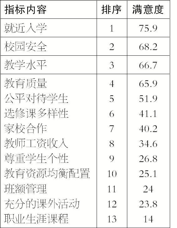 此次围绕公众关注的基础教育指标体系开展的教育满意度问卷调查,其覆盖面遍及全省16个省辖市,调查对象包括中小学的在校学生、学生家长和教师(含教育管理者)。从调查结果来看,公众对学校教育质量、教师教学水平、校园环境、义务教育阶段学校就近入学、教师公平对待学生、校园安全等项指标的满意度较高(百分比数值均在50%以上);而对教育资源均衡配置、教育经费投入(如教师工资收入)、尊重学生个性发展、课程满足学生多样化个性化发展、班额管理和家校合作等项指标的满意度相对偏低(见表2)。