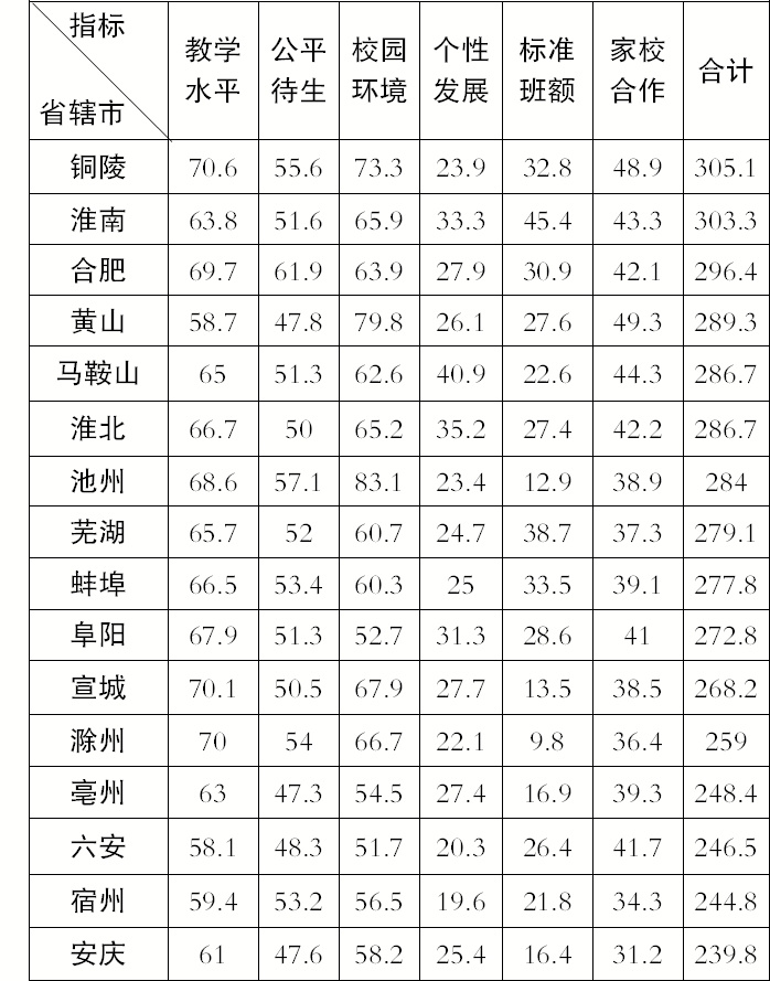 满意度较高的三项指标中,“教学水平”满意度排在前5名的城市依次是:铜陵、宣城、滁州、合肥、池州;“公平待生”满意度排在前5名的城市依次是:合肥、池州、铜陵、滁州、蚌埠;“校园环境”满意度排序的前5名城市依次是:池州、黄山、铜陵、宣城、滁州。然而,在尊重学生个性发展方面,16个省辖市的公众满意度整体偏低,近七成地市的满意度竟然未达到30%;班额超标现象普遍存在,且各市情况存在较大差异,达标率从9.8%到45.4%不等;家校合作的重要性虽已逐渐为大多数公众认识到,但是在实践层面仍有诸多欠缺,只有40%左右的满意度。如何进一步发挥家校合作对学校教育和学生发展的积极影响亦成为当前一个重要的教育议题。