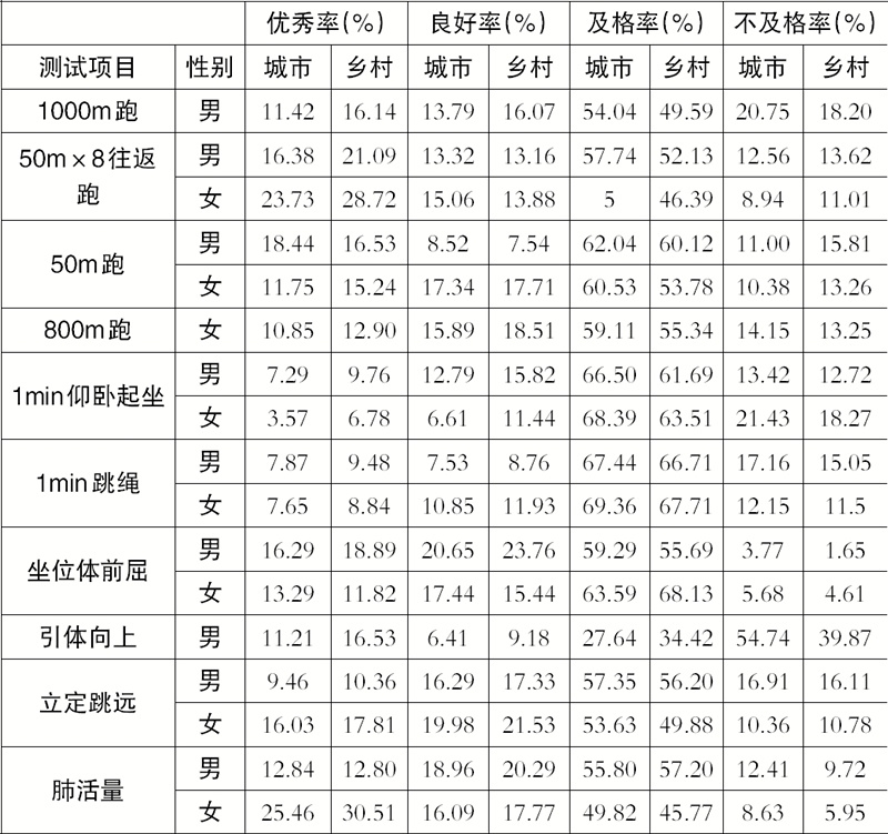 5.小学阶段女生身体素质城乡对比:城市50m跑普遍等于或稍快于乡村;城市坐位体前屈普遍低于乡村0.3cm~0.7cm;城市1min跳绳普遍少于乡村0.3次~5.5次;城市1min仰卧起坐普遍少于乡村1.4次~1.7次;城乡50m×8往返跑基本持平。