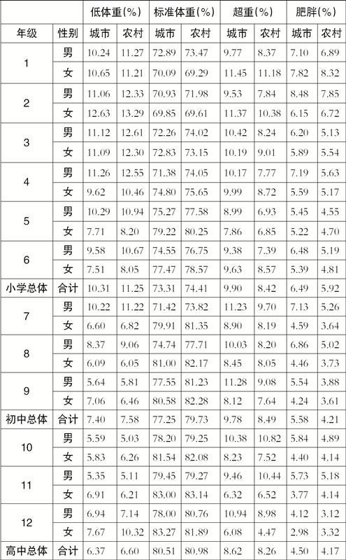 表2 安徽省中小学生各年级体重等级情况一览表(均值±标准差)