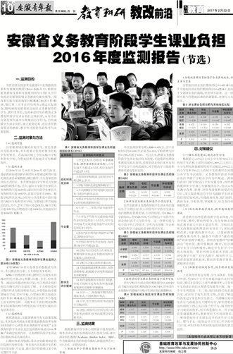 为贯彻落实国家和安徽省《中长期教育改革和发展规划纲要(2010-2020年)》,根据安徽省教育改革和发展规划领导小组《关于印发推进安徽省县域义务教育均衡发展等三项改革实施方案的通知》(皖教改〔2012〕1号)精神,依托第三方专业评估机构,通过问卷调查,随机抽取安徽省部分地区义务教育阶段学生、教师及家长,监测并适时发布我省义务教育阶段学生课业负担总体状况,从而为在全省范围内基本实现规范办学行为,切实减轻学生课业负担,建立起稳定的、适应素质教育要求的教育、教学秩序提供咨询参考与决策依据。
