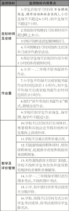 表1 安徽省义务教育阶段学生课业负担监测指标体系(2016)