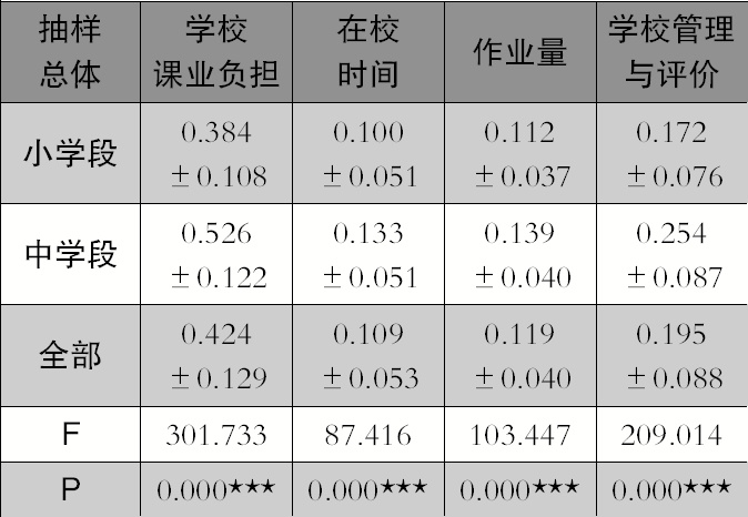 虽然安徽省义务教育阶段学生课业负担指标处于合理区间,但小学段与中学段学生课业负担指数有显著差异,小学段较低,为0.384,中学段较高,为0.526>0.5,可以得出:中学段学生课业负担高于小学段学生。这一结果可能与初中段学科门类增多、学科内容增繁、学业难度增加和学习面临的竞争性要求有关。