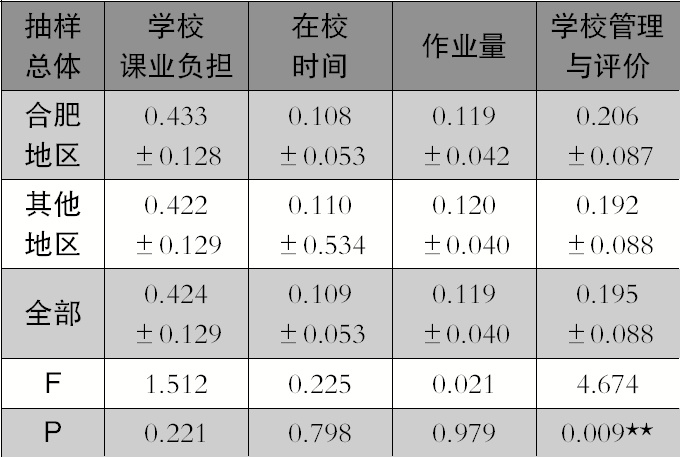 合肥地区课业负担整体得分(0.433分)高于其他地区课业负担整体得分(0.422分),也高于全省课业负担指数,但差异不显著。这一结果可能与合肥地区教育资源紧张,竞争压力大有关。