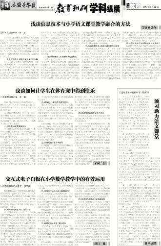 学科一见 浅谈如何让学生在体育课中得到快乐 □合肥市卫岗小学 王 策 体育课是学生们心中最喜爱的课之一,我们经常讲“乐此不疲”,学生们在体育课中能够得到快乐的体验,自然就更能学好技能,增强体能。 英国教育家斯宾塞于1854年就提出了“快乐教育”的思想。他认为,学习如果能给学生带来精神上的满足和快乐,即使无人督促,也能自学不辍。我认为,在小学体育教学上也应开展快乐教育。 一、以故事的情景晕染快乐 学生们都喜欢听故事,在体育教学中教师可以通过讲故事设置一个小情景,引导学生发挥想象力,从故事中不仅学习了知识和技能而且得到了快乐。 如在小学低年级立定跳远的教学中,将内容设置为小青蛙学本领,小青蛙跳荷叶。在故事的情境中学生们更能快乐地练习,更容易学会掌握。将注意力和反应能力练习设计为阿水的故事,在故事中学生听到指定的“水”字时快速做出事先约定好的动作,这样的方式有趣快乐实效。将耐力跑设计成红军长征中不畏艰难险阻、为到达根据地克服种种困难的情境,将教材内容与当年红军艰苦奋斗的故事情景结合起来。学生在革命传统教育下,练习耐力跑的信心更足了。 二、以游戏、比赛的方式激发快乐 游戏作为体育教学中不可或缺的形式,深受学生的喜爱。在课堂中不管是低年级的学生还是高年级的学生听到教师宣布做游戏时都会面露喜色,甚至欢呼雀跃,在游戏和比赛中学生们不仅得到了快乐,更学到了技能,体验到了团队协作、集体主义精神。 如在热身跑中可以加入喊数抱团,在跳短绳中加入跳绳比多等游戏,在团队训练时加入“千手扣”等游戏,学生们在欢声笑语中学习知识掌握技能。比赛也是学生非常喜爱的形式,在比赛中学生的潜能和兴趣被充分地启发,真可谓乐此不疲了。如接力比赛、掷远、投篮比赛等。 三、以幽默的语言引导快乐 在体育教学中,教师可以使用幽默的语言引导学生在会心一笑中体会快乐。 如体育课上,有学生不注意听课时,我会间接表扬:“苹果组的3号同学很注意听讲。”让其意识到自己错了并且主动改正;学生注意力不够集中时,我就唱一句“对面的女孩(男孩)看过来……”就能把全班学生的注意力集中起来;当学生回答问题回答得很好,我说:“太好了,聪明的阿凡提都比不过你。”对发现问题的同学说:“你简直有一双孙悟空的火眼金睛。”对合作成功的小组夸奖道:“你们真的是黄金搭档!”学生在快乐的氛围中更容易接受新的知识技能。 四、以成就成功的方式提升快乐 体育课正是要使学生在体育活动中创造性地自我实现,体验成就成功,在其中得到真正的快乐。 如在一分钟双脚跳短绳的考核中,我们可以尽量地设置符合大多数学生水平的评判标准,使大多数学生通过不断努力尝试和练习寻求跳得更好更快的方法从而提高成绩,最终达到合格甚至优秀等级;在学习技能的时候,让学得快的、技术好的当“小老师”帮助学得慢的同学,体验成就,激发热情,使课堂充满快乐积极向上的气氛。 成就成功是学生们获得尊严的一种方式,成就成功是学生们学习的动力,有了成就成功就有了快乐,有了快乐就更愿意参与投入,收获就会更多。把快乐播撒到每个学生的心田,使他们快乐、从容、自信、有尊严地成长是我们每位体育教师义不容辞的责任。