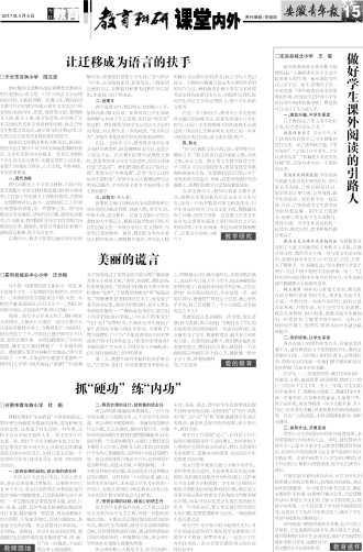 教师园地 抓“硬功” 练“内功” □合肥市青年路小学 杜 娟 我特别赞同“生命教育”中提倡的理念,要珍爱生命就要有健康的身体,要有积极生活的态度,这是基于对生活的一种热爱,这样才会有幸福丰盈的人生。班主任的工作也是一样,要拉升学生的精神生命之长度。想必萦绕在很多班主任心头最迫切的事就是班会课该如何设计,如何让班主任做一个高明的引导者,创设出灵活、有效、多样的班会活动。 一、知班会课的结构,做合格的班主任 一名班主任不会设计班会,不会上班会课,想必后果是难以想象的。从事班主任已有19个年头,班主任的管理艺术和技能也只是在实践中慢慢摸索,以及和同事交流中获得。一节完整的班会课要按照主题、背景、目标、准备、过程、延伸等基本框架提出规范的设计方案,特别值得一提的是,班会课程属于综合课程,不是知识取向,而是问题取向,是直面学生的问题。班会课要设计两条线:一条明线;一条暗线。在设计班会课的时候,要遵循学生品德形成的基本规律是“知、情、意、行”统一的规律,不能把班会课上成品德课。 二、明班会课的设计,做智慧的班主任 班会课的拟题就能体现特色,一些大而空的主题立马暴露出来,它不会受学生的欢迎。班会课的主题要鲜明,一看就知道是解决什么问题,怎么去做的,指向的是行为。主题的高明还体现在把教育的意图隐藏起来,比如说《给我一个友善的微笑》,从题目上我们知道主题是小切口的,是吸引人的,读着这样的题目学生的心是愉悦的,这样的行为也是易操作的。班会课的背景介绍必不可少,这种背景不是杂糅形的,而是从宏观、中观到微观,一步一步体悟到存在的问题,班会课是去讨论并解决这些问题的。这样细到一个词的运用,就让主体发生质的变化,本来是以学生为主体的一种设计,变成以老师的口吻在教育,没有以生为本的设计教学效果也会大打折扣。 三、悟班会课的功能,做省心的班主任 班会课具有教育的功能,它不是以直接的方式来告诉学生怎么做,而是一种隐性的规范功能。主题班会运用的是体验或讨论的形式,调动学生的情感,激发学生道德情感的动机,行使情感感染的功能,通过情感感染的功能形成班级的一种凝聚的功能,班会课中学到的往往是做人做事的风格。 班会课的核心人物是学生,由学生组织、主持、表演、表达,老师在学生有需要或出现失误时适时地点拨,由低段的“扶”到中高段的“放”,这“扶”与“放”的距离就是学生成长的收获,就是班会课功能的体现,育人细无声,教育无痕。 班主任工作需要“走心”,在日常工作中碰到问题是最寻常不过的事儿,如何家校合力帮助学生得到真正的成长,我认为需要用专业的眼光、掌握主动的原则、永远站在学生的角度去谈问题。 班主任要多观察注意力不集中的学生,老师和家长交流时,才能够更深层次地分析原因,找到原因后提出可行性的建议,这样家长才会去配合学校教育。学生身上出现的问题很多都折射出家庭教育的问题,现在的父母更多地从保护自家孩子的角度去判断和解决问题,而并没有从促进学生成长的角度去思考。作为班主任,要让家长意识到处理学生的问题,是需要策略和方法的,一味地摒弃不是处理之道。 班主任作为学校中最不起眼的主任,对学生的成长起到的作用却是至关重要的,只要坚守不放弃、智慧加专业,一定会让学生有所改变的。班主任要把教育真正的好滋味品出来!