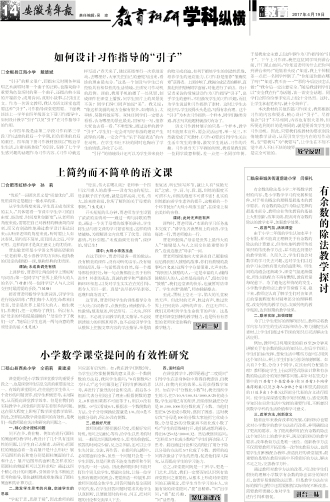 讲台三味 有余数的除法教学探讨 □临泉县城关街道前进小学 闫振礼 有余数的除法是小学二年级数学教材的内容,是小学数学学习的发展和延伸,对于相关概念的理解是最基本的教学要求。有余数的除法作为除法笔算的最基本部分,教师应在传统教育的基础上大胆创新,改革突破,提高对有余数的除法的教学水平,加强教学效果。 一、改善气氛,活跃课堂 由于小学二年级的学生认知水平十分有限,并不能真正理解关于有余数的除法的计算意义,但单纯地听教师传授知识的传统教学方法,并不能达到很好的教学效果。久而久之,学生们也会对数学的学习失去兴趣,这对学生们以后的学习主动性有很大的负面影响。师生间的沟通会逐渐减少,课堂气氛逐渐僵化,师生间的配合不再有默契,教育质量每况愈下。为了避免这种情况的发生,小学数学教师应让教学节奏慢下来、稳下来,教师应认真了解学生们对该知识点的掌握程度和对疑难部分的理解程度,改变传统的教学方法,突破传统的教学瓶颈,达到预期的教学效果。 二、联系实际,加强理解 为了让学生更好的理解知识点,教师应将教学内容与学生的生活实际相结合,努力捕捉生活素材,让学生们通过本节课的知识点灵活解决生活应用。 例如,教师可以利用课堂的前15至20分钟来讲解关于有余数的除法的知识点,在后半节课让学生们自由发挥,想象生活中哪些方面可以用到这个知识点,并让学生们自己创设情境解题。如共有7个梨,分给3个同学,应该如何分配最合理?教师指定学生上台运用竖式除法计算和有余数的除法部分的知识解答问题,并针对在竖式计算中的7(共有7个梨需要分)和3(共有3个同学要得到梨)以及2(每人分配2个梨)和竖式最底部的1(还多出1个梨)这四部分代表的含义进行提问。使学生深深感受数学知识的魅力,感受到数学知识在日常生活中发挥的重要作用,不断意识到数学学科的生活价值和学习意义。 三、改革方法,创新意义 随着近年来教育改革的发展,《新课标》也要求对小学数学的教学方法进行改革,并明确提出了更高的要求。为了提高教师们在有余数的除法这个知识点上的教学水平,满足《新课标》的教学要求,改革教育方法是唯一途径。创新教学方法不仅需要教师开拓思维一改传统教育方法,也需要学生们积极配合教师,营造良好的课堂氛围,最重要的是要在教育实践中多摸索好的方法,解决不足之处,完善教学方针。 通过教师对教学方法的改革,可以使学生们很快的理解小学数学有余数的除法部分的知识点,也更容易掌握除法运算。但是教学方法在实际的操作过程中还需要根据实际情况不断改善,需要教师更耐心地对学生进行引导和督促。