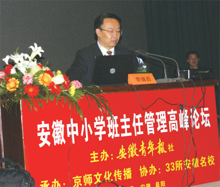 他被誉为当今的陶行知,中国的苏霍姆林斯基,目前国内各大教育论坛人气最旺的名师之一……“北有魏书生,南有李镇西”。李镇西阜阳讲学,势必在皖北乃至安徽教育系统引发强烈的轰动效应。在主持人介绍完李老师的经历和获得的各种荣誉后,李老师接管了会场,和在场的听众一同开启了做最好班主任的“和谐之旅”。