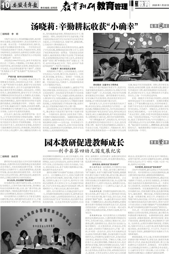 同时,利辛县第四幼儿园通过安排外出学习,引导教师将教育理念变成行为,最终落实在促进幼儿发展上;改革低效的培训方式,建立适合园所实际的“园本”培训机制,促进教师专业化有效发展。以灵活多样的参与式培训、行动研究、案例教学、反思性教学、叙事式研究培训等,充分发挥教师主动性,转变教师教育观念,促进教学研究行动。