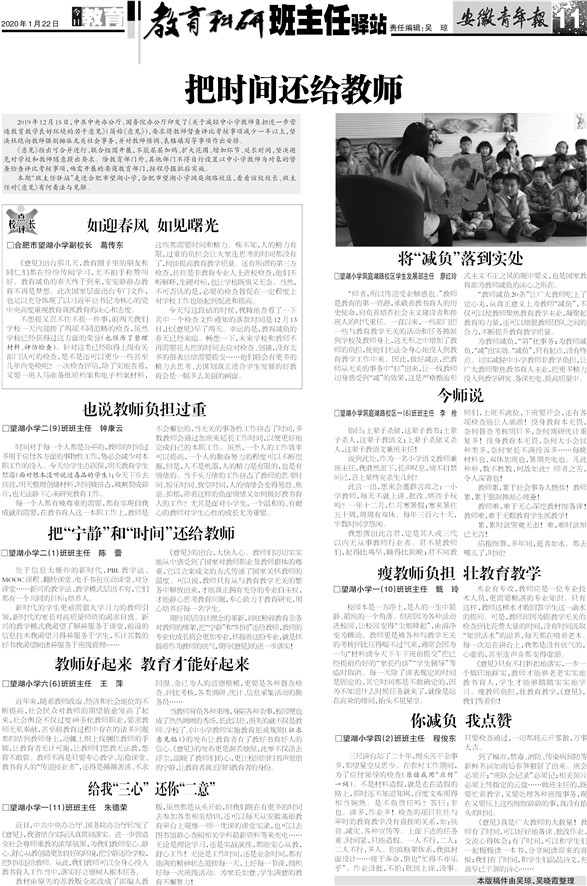 本期“班主任驿站”走进合肥市望湖小学,合肥市望湖小学洞庭湖路校区,看看该校校长、班主任对《意见》有何看法与见解。
