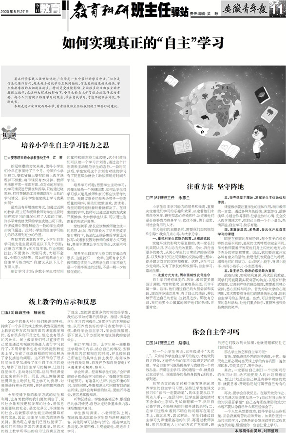 对一个小学生来说,五年级是个“大坎儿”。只有培养学生自主学习的能力,才能做到自立自强,才能在今后的学习中取得更好的成绩。学会自主学习就是提高学习成绩的一个有效办法。所谓自主学习,说的通俗一点,就是自己主动学习。现在倡导的是终身教育:活到老,学到老。