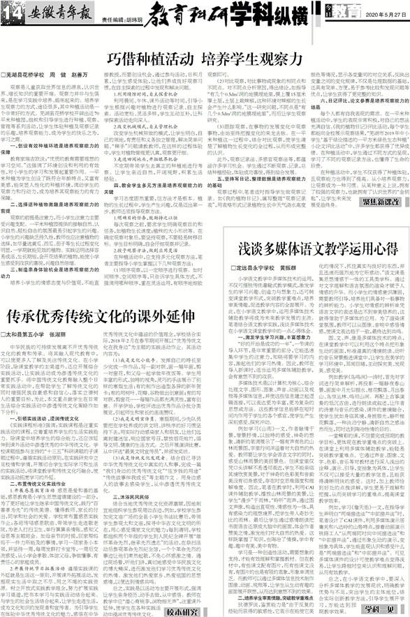 观察是儿童获取世界信息的源泉,认识世界、增长知识的重要开端。观察力并非与生俱来,是在学习实践中培养、锻炼起来的。培养学生观察力的方式、途径很多,其中种植活动是一个非常好的方式。芜湖县花桥学校开辟出近70平米种植园,组织和引导学生进行种植、观察、管理等系列活动,让学生体验种植及观察记录的乐趣,培养观察能力,成为学生的快乐之为,学习之需。