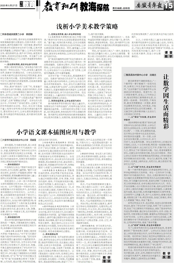 4.提升审美能力 规范价值导向 小学课本中的插图都具有很高的艺术价值和文化价值,其中不乏名家之作,如《白鹅》中的插图是丰子恺所画。鉴于图画本身更强的感染力,教师可通过插图对学生进行美育教育,陶冶情操,提升学生的审美能力和语文素养。透过《狼牙山五壮士》《丰碑》等课文中的插图,令学生明白如今的幸福生活来之不易及发扬继承先辈们不怕牺牲、艰苦卓绝精神的必要性。
