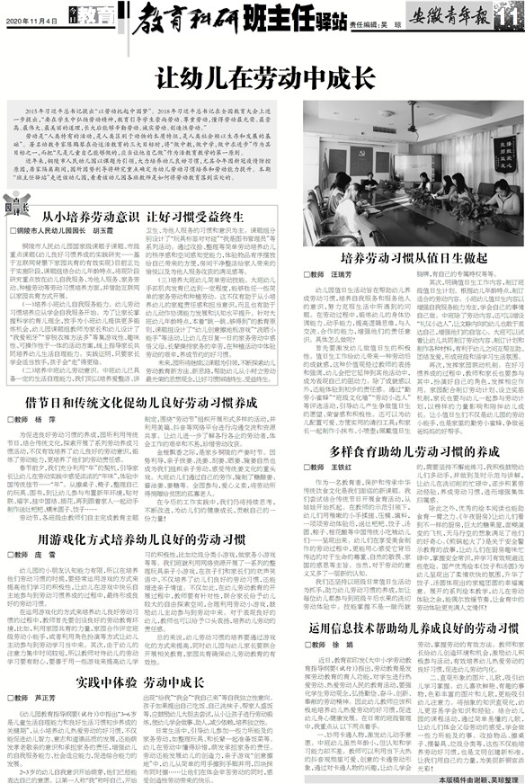 近年来,铜陵市人民幼儿园以课题为引领,大力培养幼儿良好习惯,尤其今年因新冠疫情防控原因,居家隔离期间,园所因势利导将研究重点确定为幼儿劳动习惯培养和劳动能力提升。本期“班主任驿站”走进该幼儿园,看看该幼儿园各班教师是如何将劳动教育落到实处的。