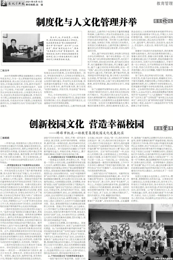 教育管理 创新校园文化 营造幸福校园 ——蚌埠市机关一幼教育集团校园文化发展纪实 □郭莉莉 一所有内涵、有温度的幼儿园必须有扎实的校园文化建设作为支撑,每每谈及校园文化,深感是职业追求的向往、是职业幸福的体现,更是和谐团队的根基,在实践的过程中通过思考与行动,调整与探索,集团智慧,聆听教师需要,不断创新活动载体。现立足管理实践,试从以下三个方面谈谈创新校园文化的几点思考和做法: 一、研究型校园文化下的教师专业化成长 一是研究型校园文化应扎根在园本课程中。研究型校园文化是为了提升教师教育智慧,放大自身“教无定法”的魅力,充分将信任、合作、共享作为发展重点,园本课程在追随幼儿、解读幼儿中得以呈现。园里各年级组开展的富有特色的系列开放性活动体现了园本文化的内涵与教师的教育机智。如请大班医生家长来园进行助教活动《生命的奥秘》,医生家长把专业的语言用浅显易懂的图文形式讲解、使得幼儿们对热爱生命、珍惜生命的知识又多了理解;又如结合区角游戏“医生与病人”主题活动中遇到的困惑,组织幼儿开展“走进120急救中心”活动,并鼓励幼儿以“小记者”的身份去咨询工作人员,体验自主性学习的成功,这些园本课程的实施开展和教师专业化成长相得益彰。 二是研究型校园文化应扎根在团队创造力中。“追求与创造”是班级文化建设的重点,更是校园文化得以整合的基础。培养具有创新精神的幼儿,教师必须具备创新精神和创新能力。园里倡导教师有求异精神,如在班级环境创设中师幼共同探讨班级近阶段开展的活动。教师带领幼儿进行个性化创意布置,布置的环境既要体现师幼互动,又能体现对教育活动的延伸。此外,园里深感教学现场中的引领与创造也是至关重要的,如学期技能技巧大练兵活动、自主性游戏观摩研讨活动、体育游戏课程都需要教师个体和团队创造力共同实现,在教师参与式的研究中碰撞观点、反思自我、不断提升。 三是研究型校园文化应扎根在学习型组织中。研究型校园文化还要建立在反思——实践——再反思——再实践的学习系统中,建立计划反思、课程反思、学期总结反思等环节。学期初,通过交流、推荐有价值、有思想的计划,帮助每个班级形成具有班级文化特色的、详致可行的学期计划。期间,开展一系列读书分享会、美文欣赏,如何听课评课等等。学期结束,教师们将一学期的收获、亮点用PPT的形式进行分享,让大家共同见证工作成果,找到差距,促进成长。学习型组织的创建致力于培养教师富有创造力、积极的思维,积极向上、勇于探索的精神以及善于汲取信息的能力等。 二、和谐型校园文化下的教师职业幸福感 一是营造文化氛围、净化感化心灵。和谐是一个团队永恒的主题,这就需要领导者加强人文关怀,凝聚团队精神。园里真切地感受到,对教育内部的管理必须树立“跳出教育看教育”的观念,采取高效的策略调整和解决现实问题,是团队进入良性发展的状态。如在“中国梦教师梦”活动开展中,把教职工的梦想宣言连同照片制成精美的摄影展,将作品展示在文化长廊,每每师幼路过,大家都要驻足观赏,互相赞美;本学期“家园心怡报”在家园的共同努力下圆满出刊,其内容涵盖了富有文化气息的幼儿园活动、家园互动、天使宝贝秀、名师采风等多个栏目。报纸的可读性也使得教师、家长、幼儿都期盼报纸,爱上阅读,这也为园所的文化创建工作增辉添彩。 二是突出文化内涵,凝聚和谐魅力。情感的投入是幼儿园实行人文关怀不可或缺的重要方面。因此,管理者要用自己的真情去激发教职工的热情。园里以节日为契机,由工会牵头,三八节开展的“让优雅与春风同行”教职工系列文化活动,有园内的青年教师才艺展、有走进大自然的“洗肺”之旅,为大家的节日注入新鲜感,让大家充分感受到集体的温暖,团队的魅力,使得大家的幸福感溢于言表。 三是规划文化愿景,回归爱岗敬业。园里在制订共同愿景规划中,体现了全体教师共同的愿望。如:“如何提高青年教师福利待遇”“如何实施良性竞争机制”“如何打造各个领域的骨干教师”“教职工四季养生水、养生汤”的制定、“教师文化之练瑜伽习书法”活动,这些都是大家集思广益提出有益于幼儿园文化建设的愿景,围绕教师提出的好的建议,尽可能地满足教职工切实可行的需求,因此共同愿景规划增强了向心力,也使教职工对幼儿园的未来充满信心,促进教师团队以主人翁的心态参与到幼儿园的各项活动中,更好地做好常态化工作。 三、个性化校园文化下的教师自律自省力 一做到“每日四问”彰显师德。在园门口的文化墙上有这样一段话:“第一问:我的身体有没有进步?第二问:我的学问有没有进步?第三问:我的工作有没有进步?第四问:我的道德有没有进步?”这就是陶行知的每日四问。“做有价值的事”和“坚持做好身边的小事”是幼儿园提出的目标。正如“细节决定成败”一样,比如幼儿的观察记录,以前都是临近上交时网络上抄袭应付差事,如今教师们找到了好的方法每天记录一小段,从一句话记起,从一段话记起,经过整理就是一篇很好的教育随笔,工作中许许多多的小事构成了很有价值的观察记录。教师们在这“四问”的熏陶下,也在自觉践行着工作的使命感和责任感。 二做到“