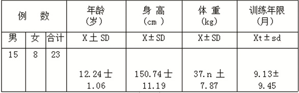 实验对象:本校击剑队员,共计23人,身体健康,实验前经心电图和物理检查,均无心血管系统疾患,他们的一般身体状况见表一。实验方法:实验共分两个部分进行。