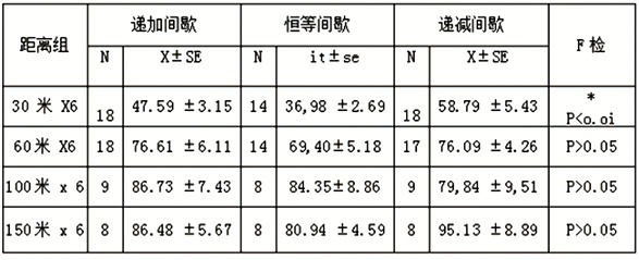 2.统计分析结果表明在同一距离段的三种不同间歇方式之间,平均成绩并无显著性差异,这样就可以排除强度因素的不同对机体的影响,从而使我们可以对不同间歇方式的跑后血乳酸均值之间进行比较分析。