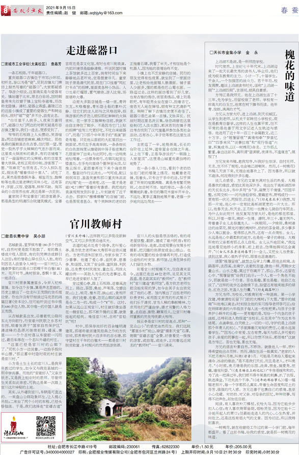 槐花的味道 □天长市金集小学 金 永 上泊湖不是湖,是一所师范学校。 时代使然,上世纪七十年代末,上泊湖迎来了一批天长最优秀的读书人,毕业后,他们成为皖东教育的主力。小计一下,十届学生,千余人,一个加强团的战斗力。若干年后,校友偶聚,趣谈上泊湖读书时光,谐称“上泊湖一期”“上泊湖四期”,言语间,颇具自豪感。 方传江是我师兄。他在上泊湖生活了十三年,先为学生,后留校做了老师。学校有一排高大的白玉兰,他常在树下捧书而读。他年青、俊朗,满满的才气。 方兄从方家大圩,进上泊湖,到天长城区,从学生到老师,从机关干部转任小学校长,现在是教育总督学,这样的人生也算平常,但不平常的是他善于用文字记述人生轨迹与感悟。他选用了近十年一百三十余篇散文,近二十万字。分“屐履留痕”“真情相牵”“梦里忆旧”“四季来风”“说事拉理”和“观行悟道”六章,积集成书,以《一树槐花》命名。工作那么繁重,拿出这部书,真所谓“昼课赋,夜课书,不遑寝息”,佩服了! 方兄发来书稿,邀我写序,叫我好生惊讶。自忖无师、无名,岂不坏了规矩,也会被江湖嘲笑。然而,《一树槐花》书稿几天读下来,无理由地喜欢上了。因为喜欢,所以就不避讳,何况得到许多乐趣。 说几点感受。方兄的文章充满对生活的热爱。大概是喜欢的缘故,感觉比其他深许多。他出生于高邮湖西岸的天长东北乡,书中多用“乡”字,凝聚万千情愫。“四园平整,水网交织……河内渔船穿梭,菱藕密布,野鸭成行……更有那一状元、两探花、四进士。”(《行走东北乡》)我想,写那一片地,他心中一定有比高邮湖更宽的一片大水。所以,他春天去,秋天去,正月初一也携女儿骑自行车同去。为什么如此呢?!他反复写方家大圩,是他的根在那里。所以,圩里一缕风,拂拭一生情。清明,年三十,毫无例外,带着妻子女儿去祭奠先人。一抹朝阳,一夕晚照,桑树港边的油菜花,铜龙河埂的槐树叶,奶奶的茶食箱,多少事多少人难以割舍。爱得那么热烈,还有一点点惆怅。女儿,永远是他心中最柔软的地方,也是他一辈子的牵挂。大概所有的父亲都有那么点儿自私。女儿从外地回来,“我远远地看见她娇小的身影,赶上前去,仿佛她瞬间还会离开。”(《女儿不在身边的春节》)一会儿,又把女儿当贵客。读到这里,我心里热乎乎的,眼里也湿漉漉的。 读罢“屐履留痕”,就想立马背上行囊,跟他去皖南,去鹞落坪,去西溪,去南宁,去徽杭古道,像他一样,用脚步丈量山水。山水之趣,莫过于你离开了,那山,那水,还留在心中。“屐履留痕”给我们启示:一个人,有一个角色不能少,那就是做一个行者。苦也是趣,累也是趣。他自己也说了,“这样的徒步还会继续下去,盼望还有越来越多的绿色、红色之旅,充盈人生行囊。”(《行走鹞落坪》) 方兄为师、为校长,对教育别有一种温婉。第一小学改建,特意请校长留下门前的大槐树;下大雪,“雪中的城南”叫他难以离去;时刻惦念他的实习指导老师李巧云;给在炳辉寄读的六年级孩子每人送一枚枇杷果;与孩子分享养护小蜗牛的乐趣……更有趣的是,写给一个内急的孩子送纸,还特别选人物报道“当校长,乐在其中”作为这本书结尾。点滴牵挂,白天晚上,一切的一切,守护的是上泊湖那个年青人的初心。“手里捧着沉甸甸的责任,心里永远装着学生。”“因为心中有爱、左右有责,每天与那么多可爱的孩子、亲爱的同事在一起,所以你想不快乐,都很难!”这就是方传江。苦也无悔,累也无悔。 方兄的语言朴素自然,不矫饰。就像他人一样,质朴得希望能出点花样。然而,确如生活一般真实。“老家的人不把月亮叫月亮,叫亮(凉音)月。可能是月亮给人看起来清冷、冰凉的缘故。”是不是我们天长,而且是老人,才叫亮月。“小时候,亮月塘是我的乐园,洗澡,捞鱼,摘菱角,挖藕,嬉戏玩耍。”(《亮月塘边上的记忆》)“牛房是暖和和的,为了洗一把澡过年,我们顾不得牛屎粪的刺鼻,扒了衣服,跳进澡盆,下功夫洗个干净。”(《过年的那些事儿》)看一幅幅老照片,每一个字都那么真实,带着生命温度和泥土的芬芳,强强的代入感。方兄还善于包裹自己的感情,甚至小心收藏。对奶奶、对父亲、对母亲的回忆,种种琐事,写得不动声色,却如在目前。 阅读,有人喜欢朴刀棒杖,长枪大马,因为它能步步扣人心弦;有人喜欢倚翠偷期,烟粉灵怪,因为它能十二分地吊起人的胃口;但最能走进人的内心,心生热爱,并向往之,还是这些有烟火气的文章。因为切近,所以我特别喜欢。 一树槐花,就在他曾经工作过的第一小学门前,每年都盛开。看了这部书稿,给我的感觉,就是那一树槐花的味道。
