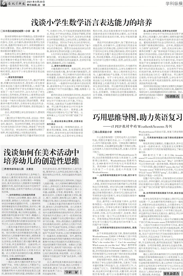 学科一见 浅谈如何在美术活动中培养幼儿的创造性思维 □界首市新华幼儿园 王素芝 幼儿美术活动是培养幼儿各种能力,提高幼儿素质的有效手段,美术活动是手、眼、脑密切配合,协调发展的一种智能活动,美术活动在幼儿园教育中发挥着很重要的作用,良好的美术活动不但有利于提升美术技能,还有利于培养幼儿的创造性思维。 一、如何培养幼儿的创造性思维 一是为幼儿创设健康、融洽、轻松、活跃的氛围,鼓励幼儿大胆创新。情绪对教学活动有着极其重要的作用。心理学研究表明情绪紧张则思维受限制,良好的心情则思路开阔,思维敏捷,而情绪低落,心情烦闷则思路阻塞,难以发挥创造潜能。这就要求教师在教学中放下架子,尊重幼儿的主体地位,引导幼儿积极主动参与,调动幼儿的所有感官参与到教学活动的各个环节之中,让幼儿保持愉快轻松的心情。 二是在丰富多彩的活动中培养幼儿的绘画兴趣。喜欢画画是每个幼儿的天性。他们对美术活动有着潜在的兴趣,但是有的幼儿却随着年龄的增长,减弱或者丧失了这种天性。我们成人都有这样的生活体验:如果是自己感兴趣的事情,就乐于去做,并且做得很好。这就说明:兴趣是最好的老师。因此,笔者认为幼儿园美术教育首先是培养幼儿对美术的兴趣。幼儿对美术活动潜在的兴趣,需要教师诱发、引导、培养和爱护。 二、怎样培养幼儿的绘画兴趣 一是幼儿美术兴趣的培养首先从“涂鸦期”开始。对刚入园的幼儿不要急于让他们画什么东西,可以视频文件先让他们观看教师和中大班的哥哥姐姐是怎么画的,激发他们作画的欲望,涂鸦是幼儿们喜欢的游戏活动,教师要鼓励幼儿进行涂鸦,要保护幼儿这种乱涂乱抹的兴趣,不要忽视和过分苛求,为其创造轻松和谐的气氛。 二是提供多样化的工具和材料,引起幼儿绘画兴趣。幼儿对新鲜的事物有强烈的好奇心,多样化的工具和材料能激发幼儿的操作欲望。绘画时可选择的工具十分丰富:油画棒、记号笔、棉签等等。在手工教学活动中,应提供大量的美工材料:黏土、剪刀、双面胶、颜料等让幼儿操作。教师通过引导,使幼儿在体验中萌发创造力。 三是通过丰富多彩的教学形式和手段,激发幼儿的创新性思维。幼儿的美术活动和游戏是分不开的。鼓励幼儿在游戏中注意观察物体的颜色和形状,同时采用游戏的形式使幼儿学习一些简单的绘画技能,在寓教于乐的过程中使幼儿获得学习的乐趣。例如:我在教幼儿画圆和感受色彩美的活动时,会带幼儿们到户外的阳光下玩“吹泡泡”的游戏,引导幼儿观察“泡泡”的颜色、形状和大小,并和幼儿们一起玩“吹泡泡”的游戏,让他们带着愉悦练习一些基本的、枯燥的线条。另外,教师也要学会有效地利用现代教育技术和手段将教育中的难点用动画的形式展现给他们,将会收到意想不到的效果。如教幼儿们画“放风筝”时,我利用下班时间拍一些“放风筝”的照片,然后做成PPT,展现给幼儿们,让他们身临其境,体验观察。幼儿们通过观察学习后画出的“风筝”各式各样,人物千姿百态。 总之,教师在美术教学活动中通过创设灵活多样的学习环境,使幼儿时常有一种新奇感,激发了幼儿学习的兴趣,同时更好地培养了幼儿的创造性思维。
