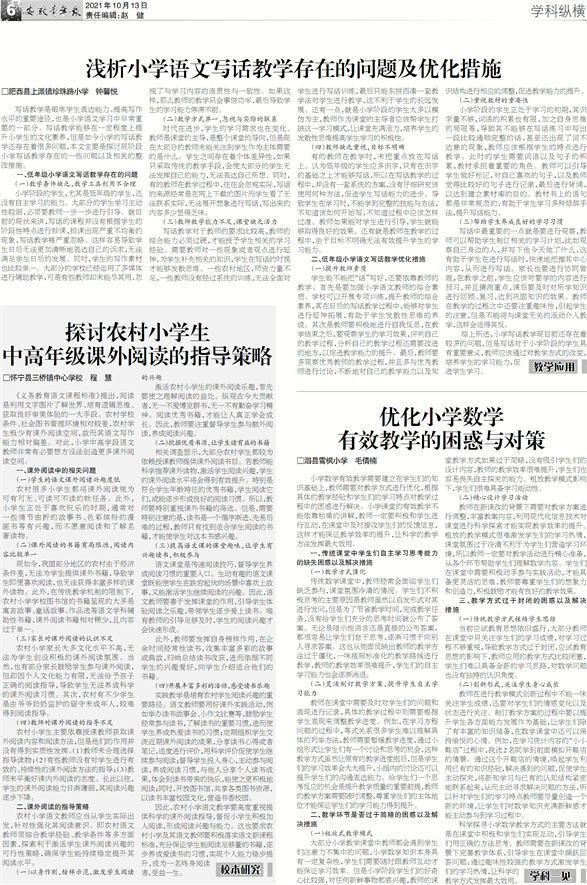 学科一见 优化小学数学有效教学的困惑与对策 □泗县雪枫小学 毛倩楠 小学数学有效教学需要建立在学生们的知识基础上,教师需要对教学方式进行优化,根据具体的教学经验和学生们的学习特点对教学过程中的困惑进行解决。小学课堂的有效教学不能依靠枯燥的讲解,教师一定要积极和学生进行互动,在课堂中及时接收学生们的反馈信息,这样才能保证教学效率的提升,让科学的教学方法发挥最大效用。 一、传统课堂中学生们自主学习思考能力的缺失困惑以及解决措施 (一)教学方式僵化 传统数学课堂中,教师经常会面临学生们缺乏参与,课堂氛围冷清的情况。学生们不积极思考的主要原因是教师虽然以启发形式对其进行发问,但是为了节省教学时间,完成教学任务,没有给学生们充分的思考时间就公布了答案。无论是暗示性语言还是直接的公布答案,都很容易让学生们怠于思考,逐渐习惯于向别人寻求答案。这也从侧面反映出教师的教学方法过于僵化,一味按照标准化的教学路线进行教学,教师的教学效率很难提升,学生们的自主学习能力也会逐渐消退。 (二)灵活制订教学方案,提升学生自主学习能力 教师在课堂中需要及时对学生们的问题和表现进行记录,具体的教学过程中则需要根据学生表现来调整教学进度。例如,在学习方程问题的过程中,等式关系很多学生难以理解具体的列举方法,教师需要暂缓教学进度,通过小组形式让学生们有一个讨论和思考的机会,这种教学方式虽然让原有的教学进度拖后,但是学生们的学习效率会大大提升,小组内的讨论还可以提升学生们的沟通表达能力。给学生们一个思考反应的机会是提升教学质量的重要前提,教师的教学方案需要随时调整,尊重学生们的主体地位才能保证学生们的学习能力得到提升。 二、教学环节是否过于简略的困惑以及解决措施 (一)粗放式教学模式 大部分小学教学课堂中教师都会遇到学生们注意力不集中的问题,小学数学知识本身具有一定复杂性,学生们需要随时跟教师互动才能保证学习效率。但是小学阶段学生们的好奇心比较强,对任何新鲜事物都感兴趣,教师的课堂教学方式如果过于简略,没有吸引学生们的设计内容,教师的教学效率很难提升,学生们也容易丧失自主探究的能力。粗放教学模式影响下,学生们很难具备学习能动性。 (二)精心设计学习活动 教师在新课改的背景下需要对教学方案进行调整,丰富教案内容,利用现代化信息技术对课堂进行科学探索才能实现教学效率的提升。粗放的教学模式很难激发学生们的学习热情,课堂氛围过于冷清不利于为学生们营造学习环境,所以教师一定要对教学活动进行精心准备,从各个环节帮助学生们理解数学内容。学生们在课堂中需要积极动手参与实践活动,才能具备更灵活的思维,教师要尊重学生们的想象力和创造力,积极鼓励才能有良好的教学效果。 三、教学方式过于封闭的困惑以及解决措施 (一)传统教学方式桎梏学生思维 当前应试教育思想依旧盛行,大部分教师在课堂中只关注学生们的学习成绩,对学习过程不够重视,导致教学方式过于封闭,应试教育思想的影响下,教师应用的教学方式比较闭塞,学生们难以具备全新的学习思路,对数学问题也没有独特的认识角度。 (二)创新形式,关注学生身心成长 教师在进行教学模式创新过程中不能一味关注学生成绩,还要对学生们的情感变化以及状态进行关注。制订教学方案的过程中要以提升学生各方面能力发展作为基础,让学生们除了有丰富的知识储备,在数学课堂中还可以保持愉悦的心情。例如,在学习统计内容的“小小鞋店”过程中,我选2名同学到前面模拟开鞋店的情景。通过这个开鞋店的情境,唤起学生利用已有的知识经验,解决遇到的问题,促使学生主动探究,将新知学习与已有的认知结构紧密地联系起来,从而主动寻求解决问题的方法,所以针对学生们的学习特点教师要尽量创造一个新的环境,让学生们对数学知识充满新鲜感才能主动参与到学习过程中。 科学探寻小学数学教学方式的主要方法就是在课堂中积极和学生们实现互动,引导学生们用正确的方法思考。教师需要在新课改的背景下完善教学体系,引导学生在课堂中踊跃回答问题,通过趣味性较强的教学方式激发学生们的学习热情,让科学的教学方式发挥最大效用。