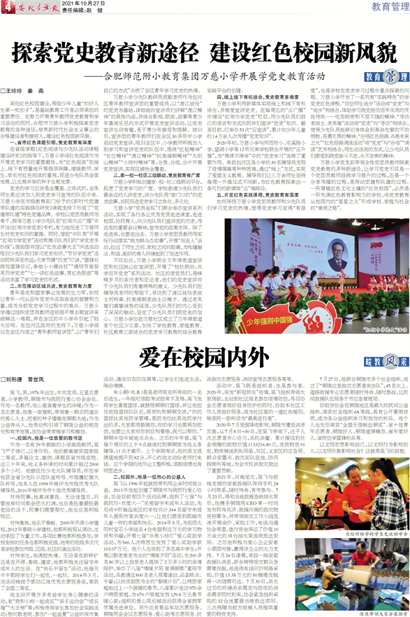皖教风采 爱在校园内外 □刘形捷 黄世凤 吴飞,男,1976年出生,中共党员,五星志愿者,小学教师,铜陵市与我同行爱心协会会长。作为一名教师,他心里装着学生的冷暖;作为一名志愿者,他像一面旗帜,带领着一群志同道合的爱心人士,把爱的种子播撒在铜都大地;作为公益带头人,他带动和引领了铜陵公益的规范化和有序发展,该协会常常被学习和模仿。 一、校园内,他是一位慈爱的教书匠 作为一名有29年教龄的小学高级教师,吴飞严于律己,以身作则。他的教案曾获国家级二等奖,多篇论文、案例、课题获省市级奖励。近三十年来,他义务补课的时间累计超过2000多个小时。他曾担任少先大队辅导员,所在学校获全省少先队示范队室称号、市雏鹰红旗大队称号,他本人在1999年被评为市级优秀大队辅导员,2010年被评为市十佳优秀辅导员。 对待同事,他真诚善良。无论谁值日,只要他有时间都会把水打满,也总是抢着最脏最危险的活干,同事们需要帮忙,他也总是积极响应。 对待集体,他乐于奉献。2009年开源小学建校,2012年春晓小学建校,他都积极服从调动,主动承担了大量工作,各项比赛他都积极参加,学校安排的任务也都积极完成,他带的班级多次代表学校参加市级、区级、社区的演出活动。 对待学生,他满腔热情。无论是在新桥矿还是在开源、春晓、建安,他都积极关注留守未成年人的生活。在“快乐午留生”活动,他每天中午都陪学生们一起吃、一起玩。2014年3月,该活动被授予感动江淮优秀志愿服务奖,荣获了全国二等奖。 他主动开展许多有益学生身心健康的活动,有“我和小树一起成长”“亲子运动会”“成长墙”“大王榜”等;积极带领学生参加社会实践活动:慰问敬老院、参加“一起益夏”公益环保市集活动、清洁旧衣回收箱等,让学生们走进生活,陶冶情操。 朱小铜(化名)是吴老师现在所带班的一名后进生,一年级时语数考试经常不及格,吴飞发现学生喜爱篮球,就鼓励铜铜打篮球,并让他担任班级篮球队队长,再伺机和铜铜交流:“你的篮球比其他同学要棒,是因为你比其他同学付出的多,大家都很敬佩你,你的学习也要再加把劲,也要让大家对你刮目相看哦,我可以帮你。”铜铜半信半疑地点点头。之后的半年里,吴飞每个周日的上午9点就准时到铜铜家为他义务辅导,11点才离开。上个学期考试,他的语文成绩猛地提升到82分,开心的他主动给老师打电话。这个学期的他作业工整积极,语数成绩也有明显进步。 二、校园外,他是一位热心的公益人 吴飞从1996年起就经常利用业余时间做公益。2013年发起创建了铜陵市与我同行爱心协会,协会目前有四个活动品牌,组织了七届“与我同行·欢度六一”关爱留守未成年人活动,先后将9所偏远地区的学校共计244名留守未成年人接到市里共度六一,让他们感受到跟城市儿童一样的幸福和快乐。2014年5月,为岳西太阳村宝石小学送去4台电脑和近万元的学习物资和书籍;开展七届“点亮小桔灯”爱心奖助学活动,为546人次特困生发放了爱心奖助学款103.07万元。他个人也资助了多名高中学生;开展以敬老爱老为主的“情暖夕阳”活动,为200多名80岁以上独居老人提供了2万多小时的亲情陪护,举办了八届“情暖夕阳 爱满铜都”重阳节活动,共邀请近800名老人观看演出、品尝糕点、午餐;以扶贫助困为主的“春暖计划”,让特困家庭能过上一个温暖的春节,八届累计走访970余户特困家庭,为670户家庭发放129.8万元春节暖心款;组织的爱心筑长城活动获得全省拥军优属先进单位。另外还有春运车站志愿服务、铜陵两会会议志愿服务、爱心助考志愿服务、抗洪救灾志愿服务、消防宣传志愿服务等等。 活动中,吴飞既是组织者,也是参与者。2020年,突发“新冠肺炎”疫情,吴飞组织带领大家捐款,主动到社区报名参加疫情防控,号召协会志愿者做好自身防护的同时,协助本社区工作人员做好服务,成为社区里的一道红色暖阳,被居民一致称颂为“最美逆行者”。 2020年7月受强降雨影响,铜陵市遭受洪涝灾害,从7月8日~30日,在吴飞带领下,近千人次志愿者齐心协力,共抗洪魔。累计接收到社会捐赠的款物价值1133216.80元,发放物资91批,物资被送到枞阳县、郊区、义安区的应急局、群众安置点、救灾部队驻地、防汛指挥所等地,为全市抗洪救灾做出了重要贡献。 2021年,河南受灾,吴飞与前线支援的安徽救援队保持手机24小时联系,随时待命、有序参与。7月23日,得知当地救援急缺抽水泵后,他携手铜陵网CEO第一时间发布同舟共济、驰援河南的救灾物资招募令,并带领救灾工作小组迅速开展询价、采购工作,电话沟通协会常委,垫付资金保证了价值10万余元的35台抽水泵连夜抵达安阳。之后他积极与爱心企业安徽小菜园对接,赢得该企业的大力支持。7月24日凌晨,来自一线安徽救援队消息,新乡转移受灾群众急需橡皮艇,他连夜电话问价网络采购,价值13.35万元的50艘橡皮艇再一次随需而达。7月30日,洪水过后的环境消杀需求与防疫的消杀需求同时到来,协会紧急组织采购的32台迷雾器当晚抵达荥阳。三次捐赠为前方救援人员提供重要的物资支持。 7月27日,他联合铜陵市多个社会组织,成立了“铜陵应急救灾志愿者突击队”,45名水上、道路救援专业志愿者随时待命、随时参战,让民间救援队伍服务于市应急管理局。 目前该协会在铜陵地区是最大的民间公益组织,荣获社