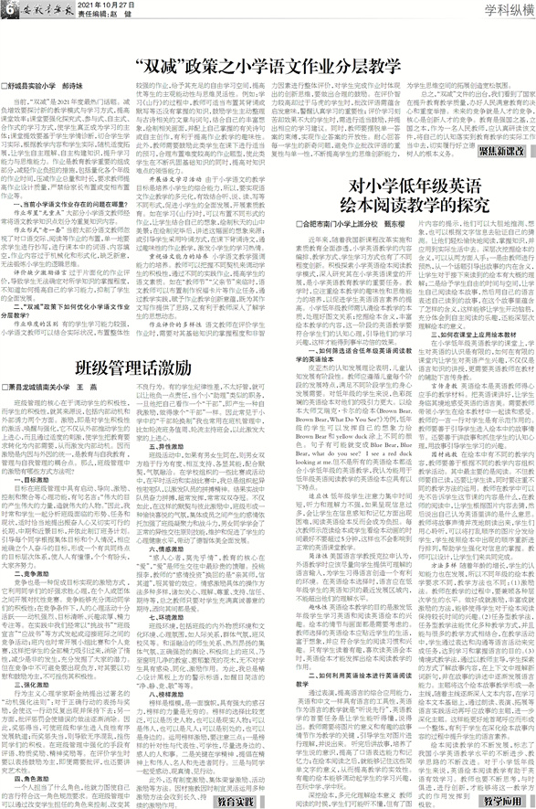 聚焦新课改 “双减”政策之小学语文作业分层教学 □舒城县实验小学 郝诗妹 当前,“双减”是2021年度最热门话题。减负增效要探讨新的教学模式与学习方式,提高课堂效率;课堂要强化探究式、参与式、自主式、合作式的学习方式,使学生真正成为学习的主体;课堂提效要基于学生学情诊断,切合学生学习实际,根据教学内容和学生实际,随机适度拓展,让学生自主理解、自主构建知识,提升学习能力与思维能力。作业是教育教学重要的组成部分,减轻作业负担的措施,包括量化各个年级的作业时间,压减作业总量和时长,要求教师提高作业设计质量,严禁给家长布置或变相布置作业等。 一、当前小学语文作业存在的问题在哪里? 作业布置“无重点” 大部分小学语文教师经常将语文教学知识点划分为重复知识内容。 作业形式“老一套” 当前大部分语文教师忽视了对口语交际、阅读等作业的布置,单一地要求学生进行抄写,进行课本中的词语、内容填空,作业内容过于机械化和形式化,缺乏新意,无法锻炼小学生的逻辑思维。 评价缺少激励语言 过于片面化的作业评价,导致学生无法确定对所学知识的掌握程度,不知道如何提高自己的学习能力,抑制了学生的全面发展。 二、“双减”政策下如何优化小学语文作业分层教学? 作业难度的区别 有的学生学习能力较强,小学语文教师可以结合实际状况,布置整体性较强的作业,给予其充足的自由学习空间,提高优等生的主观能动性与思维灵活性。例如:学习《山行》的过程中,教师可适当布置其背诵或默写等还没有掌握的知识,鼓励学生主动整理与古诗相关的文章与词句,结合自己的丰富想象,绘制相关画面,并配上自己掌握的有关诗句或自主创作,有利于提高作业教学的趣味性。此外,教师需要鼓励此类学生在课下进行适当的预习,合理布置难度较高的作业题型,使此类学生在不断巩固基础知识的同时,提高对知识难点的领悟能力。 开展语文学习活动 由于小学语文的教学目标是培养小学生的综合能力,所以,要实现语文作业教学的多元化,有效结合听、说、 读、写等不同形式,促进小学生的全面发展,开展素质教育。如在学习《山行》时,可以布置不同形式的作业,让学生结合自己的想象,绘制秋天的山中美景;在绘制完毕后,讲述这幅画的想象来源;或引导学生采用吟诵方式,在课下背诵诗文,通过趣味性的作业教学, 激发小学生的学习热情。 重视语文能力的培养 小学语文教学强调能力的培养。教师可以把握不同契机来调动学生的积极性,通过不同的实践作业,提高学生的语文素质。如在“教师节”“父亲节”来临时,语文教师可以布置制作祝福卡片等作业任务,通过教学实践,赋予作业教学创新意蕴,既为其作文写作提供了思路,又有利于教师深入了解学生的思想动态。 作业评价的多样性 语文教师在评价学生作业时,需要对其基础知识的掌握程度和非智力因素进行整体评价,对学生完成作业时体现出的创新思维,要做出合理的鼓励。在评价智力较高却过于马虎的学生时,批改评语需蕴含启发意味,警醒认真学习的重要性; 评价学习刻苦却效果不大的学生时,需进行适当鼓励,并提出相应的学习建议。同时,教师要摆脱单一答案的束缚,实现作业答案的开放性。耐心回答每一学生的新奇问题,避免作业批改评语的重复性与单一性,不断提高学生的思维创新能力,为学生思维空间的拓展创造宽松氛围。 总之,“双减”文件的出台,我们看到了国家在提升教育教学质量,办好人民满意教育的决心和重度举措。未来的竞争就是人才的竞争,核心是创新人才的竞争。教育是强国之基,立国之本,作为一名人民教师,应认真研读该文件,将自己的认知落实到教育教学的实际工作当中去,切实履行好立德树人的根本义务。